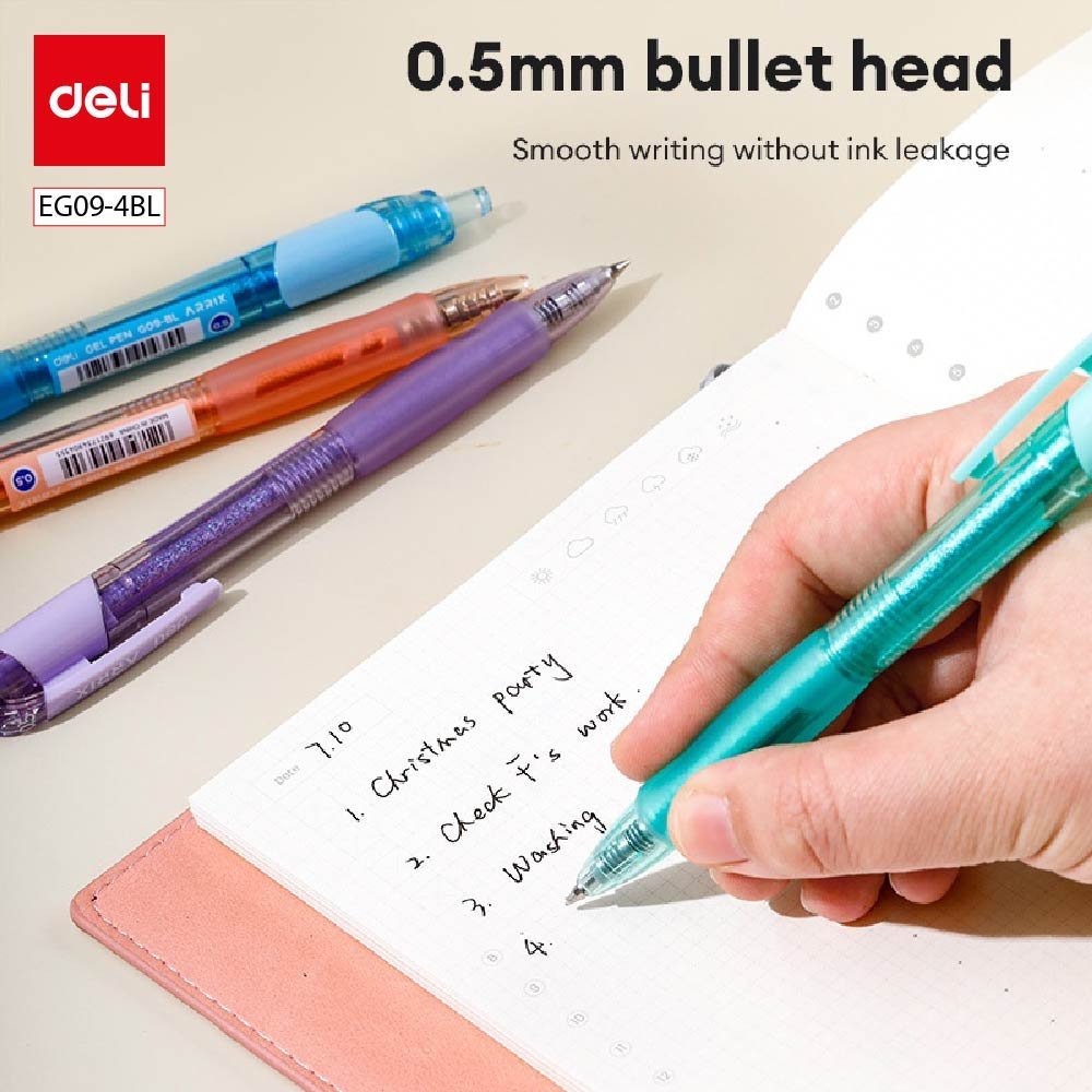 ديلي قلم حبر جل أزرق كباس – قبضة مطاط – 0.5 مم – بدن ملون (أزرق/أخضر/برتقالي/بنفسجي) – ظرف 4 أقلام – EG09-4BL